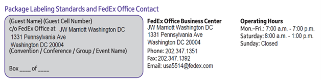 - Boxes, Tape and packaging supplies are available for purchase at the FedEx Office Business Centre found on the meeting room floor of JW Marriott